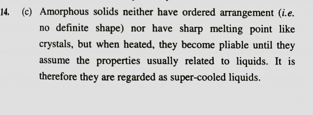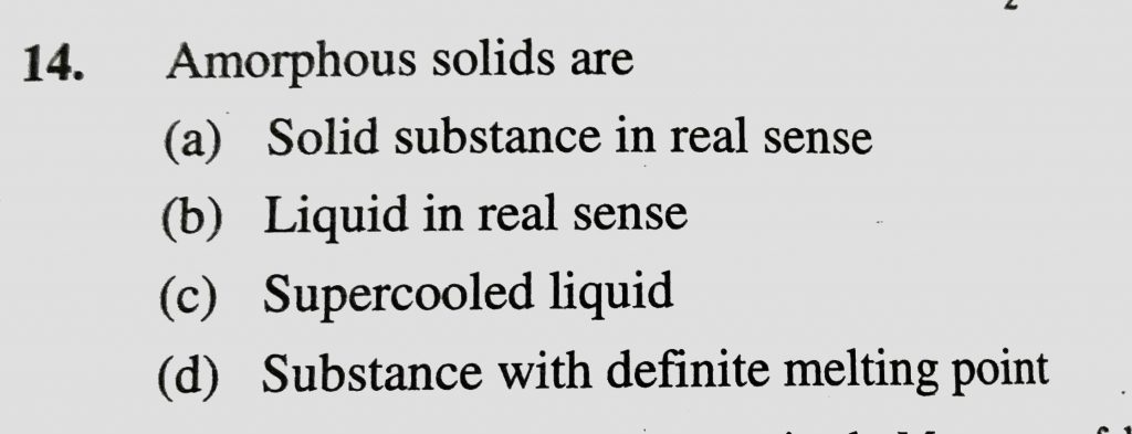 Amorphous solids are (a) Solid substance in real sense (b) Liquid in real sense (c) Supercooled liquid (d) substance with definite melting point Amorphous solids are (a) Solid substance in real sense (b) Liquid in real sense (c) Supercooled liquid (d) substance with definite melting point December 17, 2020 Category: Uncategorised (JEE Advanced Physics by BM Sharma + GMP Solutions) , Facebook Messenger WhatsApp Share this:TwitterFacebook Related
