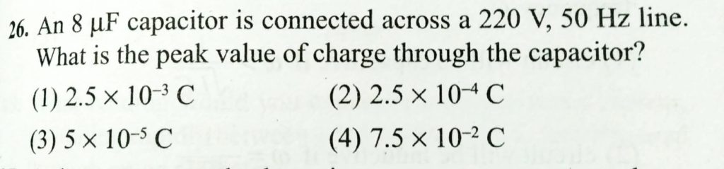 An 8 muF capacitor is connected across a 220 V , 50 Hz line . What is the peak value of charge through the capacitor ? 50 Hz line . What is the peak value of charge through the capacitor ? An 8 muF capacitor is connected across a 220 V October 27, 2020 Category: Uncategorised (JEE Advanced Physics by BM Sharma + GMP Solutions) , Facebook Messenger WhatsApp Share this:TwitterFacebook Related