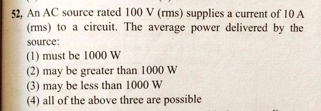 An AC source rated 100 V ( rms ) supplies a current of 10 A ( rms ) to a circuit. The average power delivered by the source : An AC source rated 100 V ( rms ) supplies a current of 10 A ( rms ) to a circuit. The average power delivered by the source : October 27, 2020 Category: Uncategorised (JEE Advanced Physics by BM Sharma + GMP Solutions) , Facebook Messenger WhatsApp Share this:TwitterFacebook Related