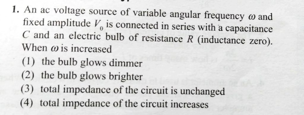 An ac voltage source of variable angular frequency omega and fixed amplitude V 0 is connected inseries with a capacitance C and an electric bulb of resistance R ( inductance zero ). When omega is increased In the given LCR series circuit find the reading ( in A ) of the hot wire ammeter. ( here all hot wire meters are ideal ) October 28, 2020 Category: Uncategorised (JEE Advanced Physics by BM Sharma + GMP Solutions) , Facebook Messenger WhatsApp Share this:TwitterFacebook Related