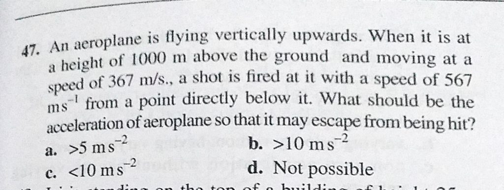 An aeroplane is flying vertically upwards. When it is at a height of 1000 m above the ground and moving at a speed of 367 m/s. a shot is fired at it with a speed of 567 m/s from a point directly below it. Two guns on a battleship simultaneously fire two shells with same speed at enemy ships. If the shells follow the parabolic trajectories as shown in Fig. A.22 which ship will get hit first? September 24, 2020 Category: Uncategorised (JEE Advanced Physics by BM Sharma + GMP Solutions) , Facebook Messenger WhatsApp Share this:TwitterFacebook Related