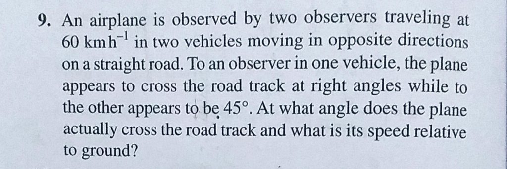 An airplane is observed by two observers traveling at 60 km/h in two vehicles moving in opposite directions on a straight road. To an observer in one vehicle, the plane appears to cross the road An airplane is observed by two observers traveling at 60 km/h in two vehicles moving in opposite directions on a straight road. To an observer in one vehicle the plane appears to cross the road September 22, 2020 Category: Uncategorised (JEE Advanced Physics by BM Sharma + GMP Solutions) , Facebook Messenger WhatsApp Share this:TwitterFacebook Related