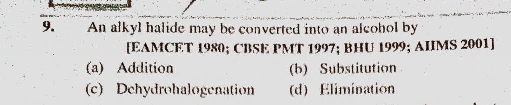 An alkyl halide may be converted into an alcohol by (a) Addition (b) Substitution (c) Dehydrohalogenation (d) Elimination An alkyl halide may be converted into an alcohol by (a) Addition (b) Substitution (c) Dehydrohalogenation (d) Elimination December 17, 2020 Category: Uncategorised (JEE Advanced Physics by BM Sharma + GMP Solutions) , Facebook Messenger WhatsApp Share this:TwitterFacebook Related