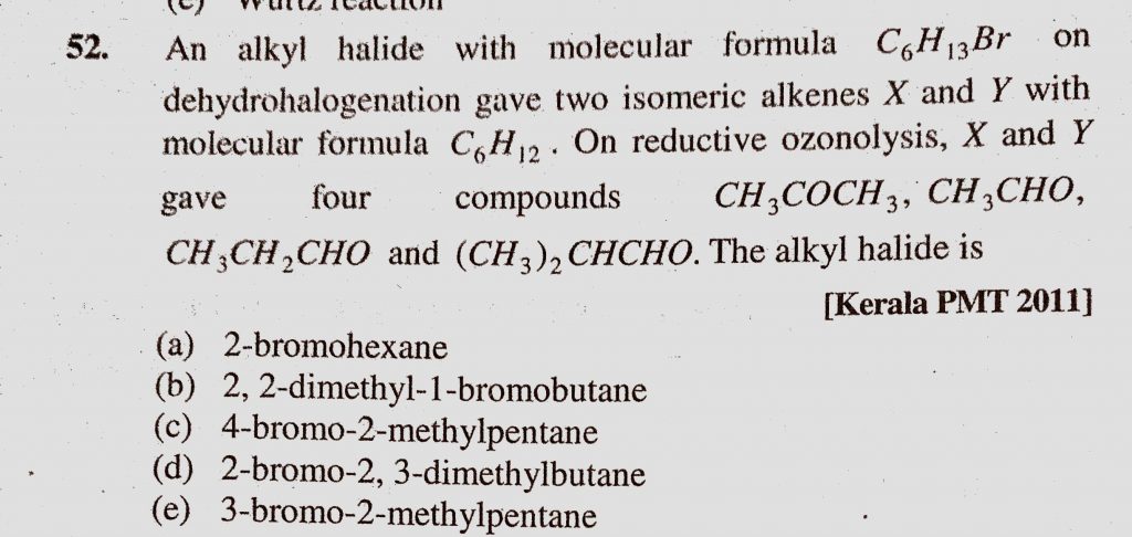 An alkyl halide with molecular formula C6H13Br on dehydrohalogenation gave two isomeric alkenes X and Y with molecular formula C6H12. On reductive ozonolysis , X and Y gave four compounds An alkyl halide with molecular formula C6H13Br on dehydrohalogenation gave two isomeric alkenes X and Y with molecular formula C6H12. On reductive ozonolysis X and Y gave four compounds February 8, 2021 Category: Uncategorised (JEE Advanced Physics by BM Sharma + GMP Solutions) , Facebook Messenger WhatsApp Share this:TwitterFacebook Related