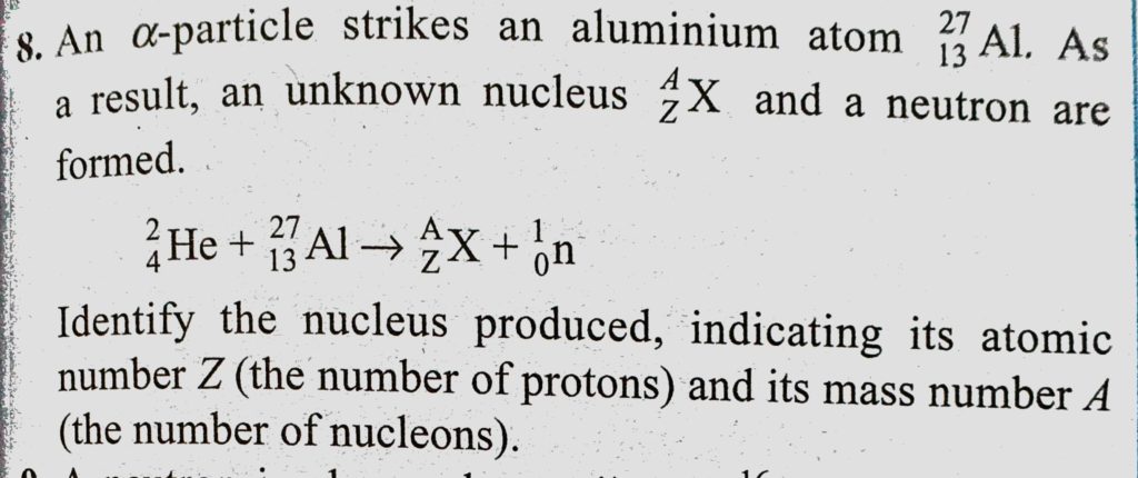 An alpha particle strikes an aluminium atom 27Al13. As a result, an unknown nucleus AXZ and a neutron are formed. Identify the nucleus produced, indicating its atomic number Z An alpha particle strikes an aluminium atom 27Al13. As a result an unknown nucleus AXZ and a neutron are formed. Identify the nucleus produced indicating its atomic number Z October 17, 2020 Category: Uncategorised (JEE Advanced Physics by BM Sharma + GMP Solutions) , Facebook Messenger WhatsApp Share this:TwitterFacebook Related