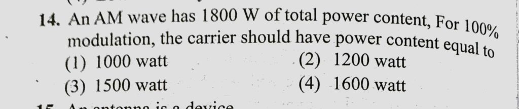 An AM wave has 1800 W of total power content, For 100% modulation, the carrier should have power content equal to An AM wave has 1800 W of total power content For 100% modulation the carrier should have power content equal to October 22, 2020 Category: Uncategorised (JEE Advanced Physics by BM Sharma + GMP Solutions) , Facebook Messenger WhatsApp Share this:TwitterFacebook Related