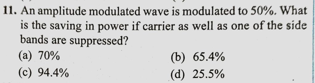 An amplitude modulated wave is modulated to 50%. What is the saving in power if carrier as well as one of the side bands are suppressed ? An amplitude modulated wave is modulated to 50%. What is the saving in power if carrier as well as one of the side bands are suppressed ? October 22, 2020 Category: Uncategorised (JEE Advanced Physics by BM Sharma + GMP Solutions) , Facebook Messenger WhatsApp Share this:TwitterFacebook Related