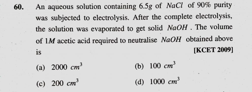 An aqueous solution containing 6.5 g of NaCl of 90% purity was subjected to electrolysis. After the complete electrolysis, the solution was evaporated to get solid NaOH. An aqueous solution containing 6.5 g of NaCl of 90% purity was subjected to electrolysis. After the complete electrolysis the solution was evaporated to get solid NaOH. December 7, 2020 Category: Uncategorised (JEE Advanced Physics by BM Sharma + GMP Solutions) , Facebook Messenger WhatsApp Share this:TwitterFacebook Related