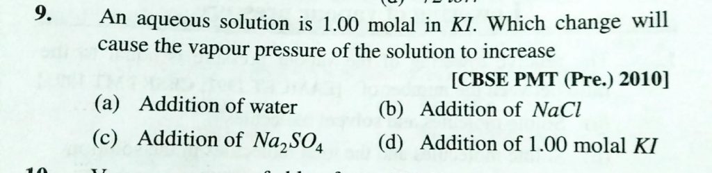 An aqueous solution is 1.00 molal in KI. Which change will cause the vapour pressure of the solution to increase An aqueous solution is 1.00 molal in KI. Which change will cause the vapour pressure of the solution to increase December 12, 2020 Category: Uncategorised (JEE Advanced Physics by BM Sharma + GMP Solutions) , Facebook Messenger WhatsApp Share this:TwitterFacebook Related