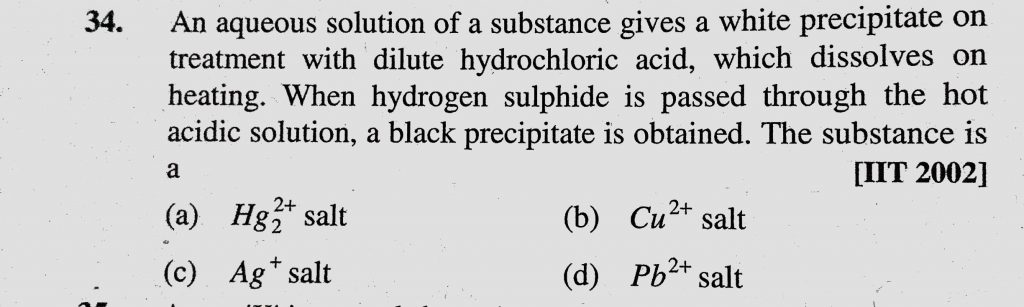 An aqueous solution of a substance gives a white precipitate on treatment with dilute hydrochloric acid, which dissolves on heating. When hydrogen sulphide is passed through the hot An aqueous solution of a substance gives a white precipitate on treatment with dilute hydrochloric acid which dissolves on heating. When hydrogen sulphide is passed through the hot December 8, 2020 Category: Uncategorised (JEE Advanced Physics by BM Sharma + GMP Solutions) , Facebook Messenger WhatsApp Share this:TwitterFacebook Related