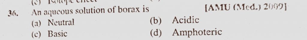 An aqueous solution of borax is (a) Neutral (b) Acidic (c) Basic (d) Amphoteric An aqueous solution of borax is (a) Neutral (b) Acidic (c) Basic (d) Amphoteric November 17, 2020 Category: Uncategorised (JEE Advanced Physics by BM Sharma + GMP Solutions) , Facebook Messenger WhatsApp Share this:TwitterFacebook Related