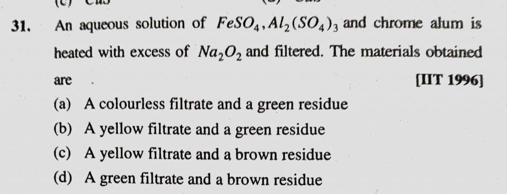 An aqueous solution of FeSO4, Al2(SO4)3 and chrome alum is heated with excess of Na2O2 and filtered. The materials obtained are (a) A colourless sfiltrate and a green residue Al2(SO4)3 and chrome alum is heated with excess of Na2O2 and filtered. The materials obtained are (a) A colourless sfiltrate and a green residue An aqueous solution of FeSO4 December 5, 2020 Category: Uncategorised (JEE Advanced Physics by BM Sharma + GMP Solutions) , Facebook Messenger WhatsApp Share this:TwitterFacebook Related