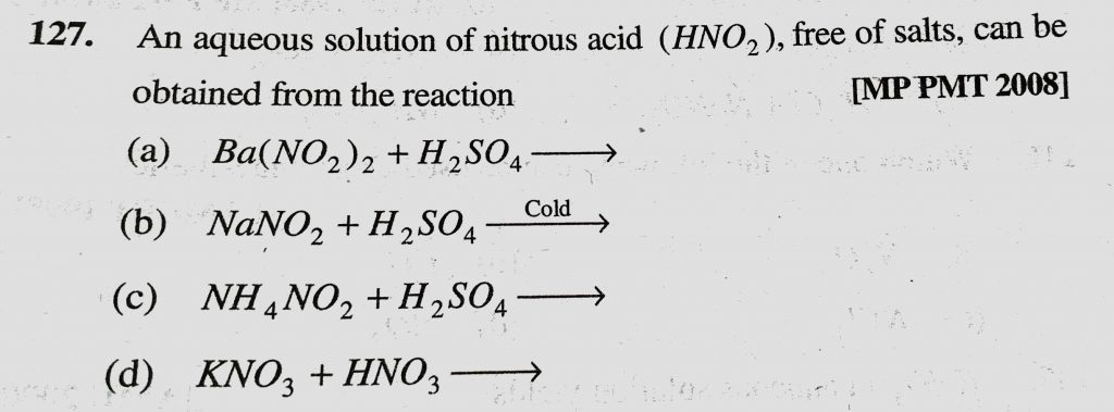 An aqueous solution of nitrous acid (HNO2), free of salts, can be obtained from the reaction (a) Ba(NO2)2 + H2SO4 An aqueous solution of nitrous acid (HNO2) can be obtained from the reaction (a) Ba(NO2)2 + H2SO4 free of salts November 23, 2020 Category: Uncategorised (JEE Advanced Physics by BM Sharma + GMP Solutions) , Facebook Messenger WhatsApp Share this:TwitterFacebook Related