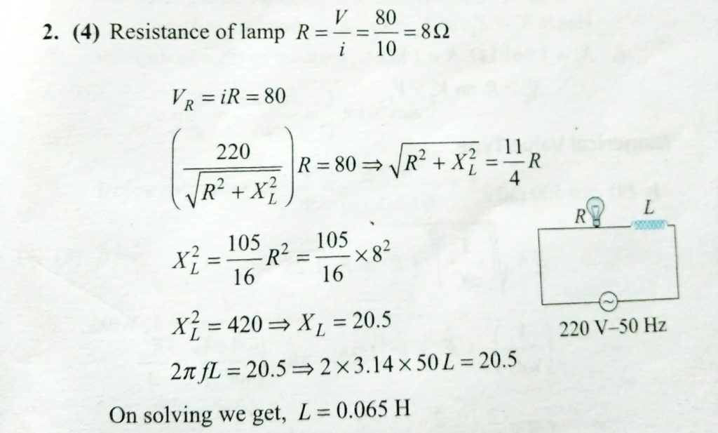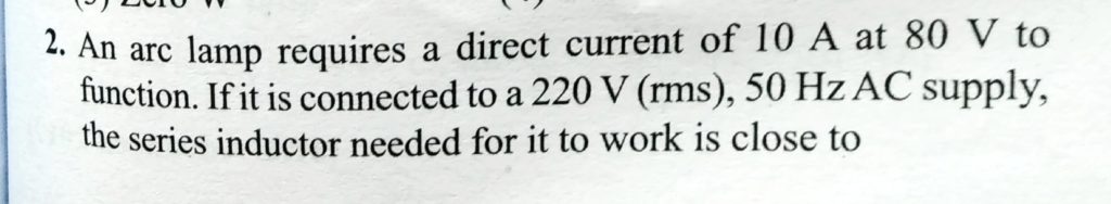 An arc lamp requires a direct current of 10 A at 80 V to function. If it is connected to a 220 V ( rms ), 50 Hz AC supply, the series inductor needed for it to work is close to 50 Hz AC supply An arc lamp requires a direct current of 10 A at 80 V to function. If it is connected to a 220 V ( rms ) the series inductor needed for it to work is close to October 28, 2020 Category: Uncategorised (JEE Advanced Physics by BM Sharma + GMP Solutions) , Facebook Messenger WhatsApp Share this:TwitterFacebook Related