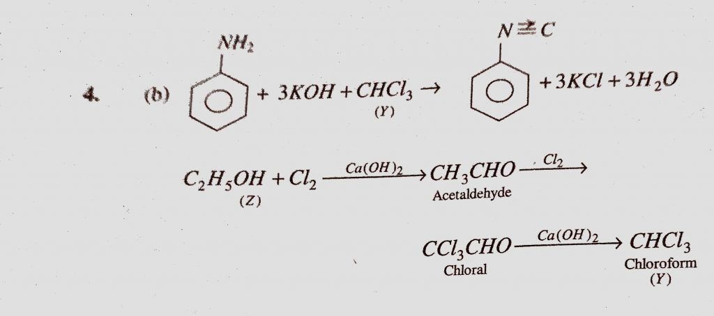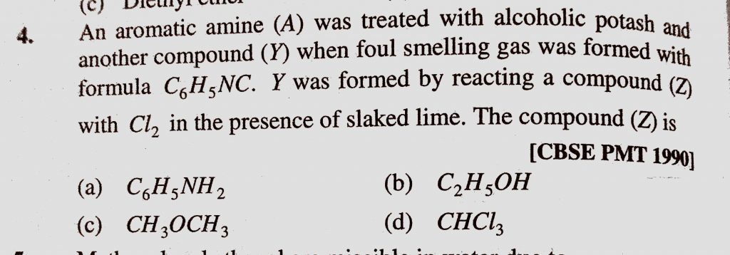 An aromatic amine (A) was treated with alcoholic potash and another compound (Y) when foul smelling gas was formed with formula C6H5NC. Y was formed by reacting a compound (Z) with Cl2 in the presence of slaked lime. The compound (Z) is C8H10O Compound (A) is found to react with NaOI (produced by reacting Y with NaOH) and yields a yellow precipitate with characteristic smell. A and Y are respectively February 10, 2021 Category: Uncategorised (JEE Advanced Physics by BM Sharma + GMP Solutions) , Facebook Messenger WhatsApp Share this:TwitterFacebook Related