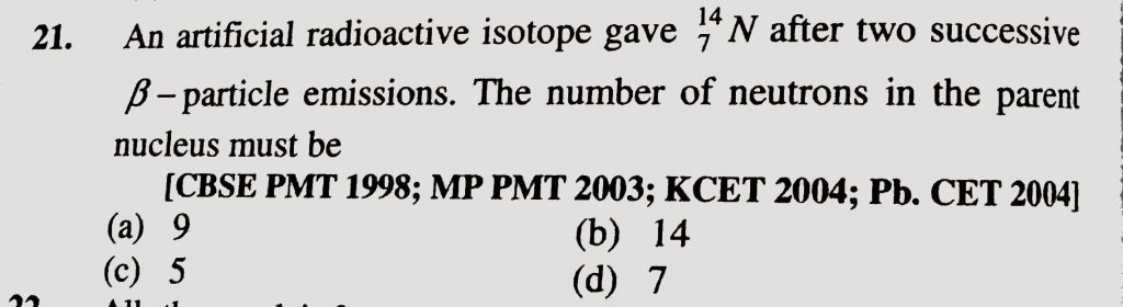 An artificial radioactive isotope gave 14 7 N after two successive bita – particle emission . The number of neutrons in the parent nucleus must be An artificial radioactive isotope gave 14 7 N after two successive bita - particle emission . The number of neutrons in the parent nucleus must be February 14, 2021 Category: Uncategorised (JEE Advanced Physics by BM Sharma + GMP Solutions) , Facebook Messenger WhatsApp Share this:TwitterFacebook Related