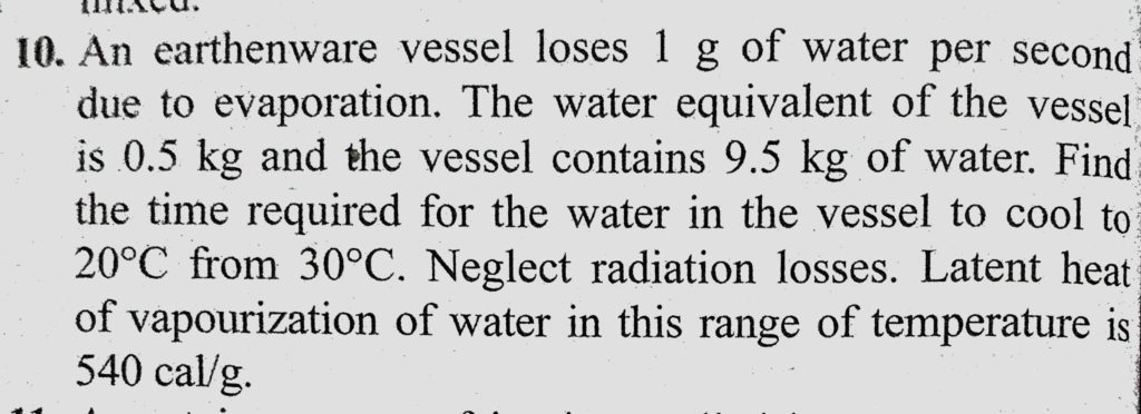 An earthenware vessel loses 1 g of water per second due to evaporation. The water equivalent of the vessel is 0.5 kg and the vessel contains 9.5 kg of water. Find the time required for An earthenware vessel loses 1 g of water per second due to evaporation. The water equivalent of the vessel is 0.5 kg and the vessel contains 9.5 kg of water. Find the time required for October 23, 2020 Category: Uncategorised (JEE Advanced Physics by BM Sharma + GMP Solutions) , Facebook Messenger WhatsApp Share this:TwitterFacebook Related
