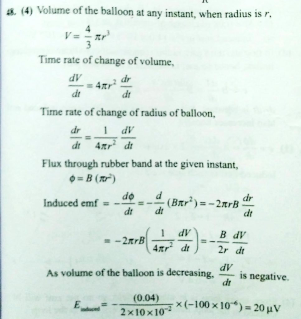An elasticized conducting band is around a spherical ballon . Its plane through the center of the balloon. A uniform magnetic field of magnitude 0.04 T is directed perpendicular to the plane of the band. Air is let out of the balloon at 100 cm^3/s at an instant when the radius of the balloon is 10 cm. The induced emf in the band is