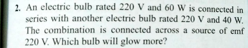An electric bulb rated 220 V and 60 W is connected in series with another electric bulb rated 220Vand40W. The combination is connected across a source of emf 220 V. Which bulb will glow more? An electric bulb rated 220 V and 60 W is connected in series with another electric bulb rated 220Vand40W. The combination is connected across a source of emf 220 V. Which bulb will glow more? November 15, 2020 Category: Uncategorised (JEE Advanced Physics by BM Sharma + GMP Solutions) , Facebook Messenger WhatsApp Share this:TwitterFacebook Related