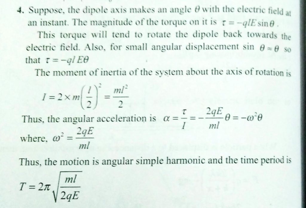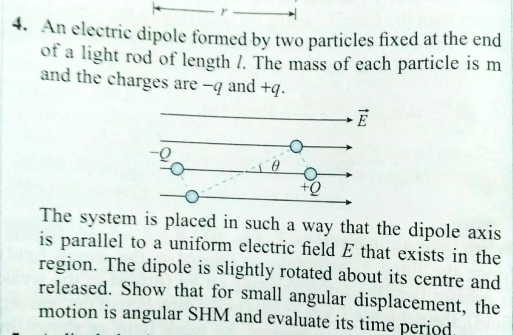 An electric dipole is formed by two particles fixed at the end of a light rod of length L. Mass m and 2m with charge q and – q. The system is placed in such a way that the dipole axis is parallel to a uniform electric field. If the dipole is slightly rotated about its center then show that for small angular displacement it’s an shm. And find time period