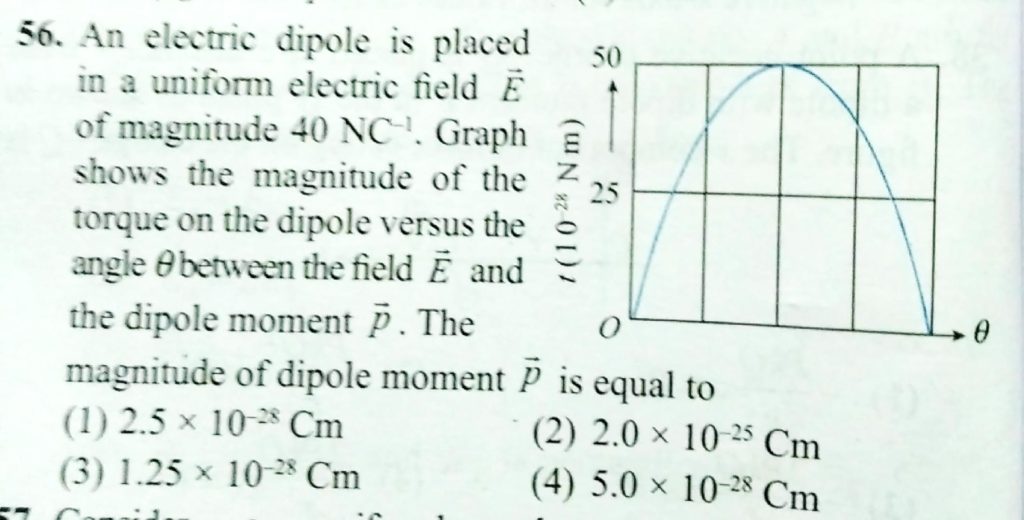 An electric dipole is placed in a uniform electric field E of magnitude 40 N/C . Graph shows the magnitude of the torque on the on teh dipole versus the angle theta between the field E and dipole moment P . The magnitude of dipole moment P is equal to