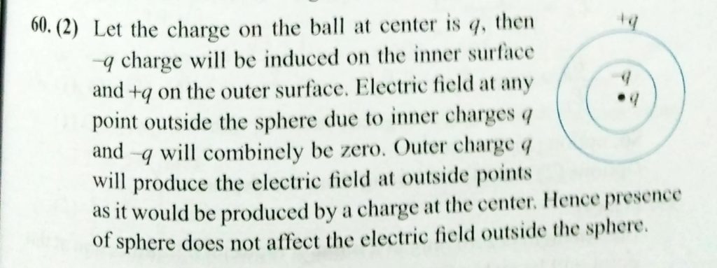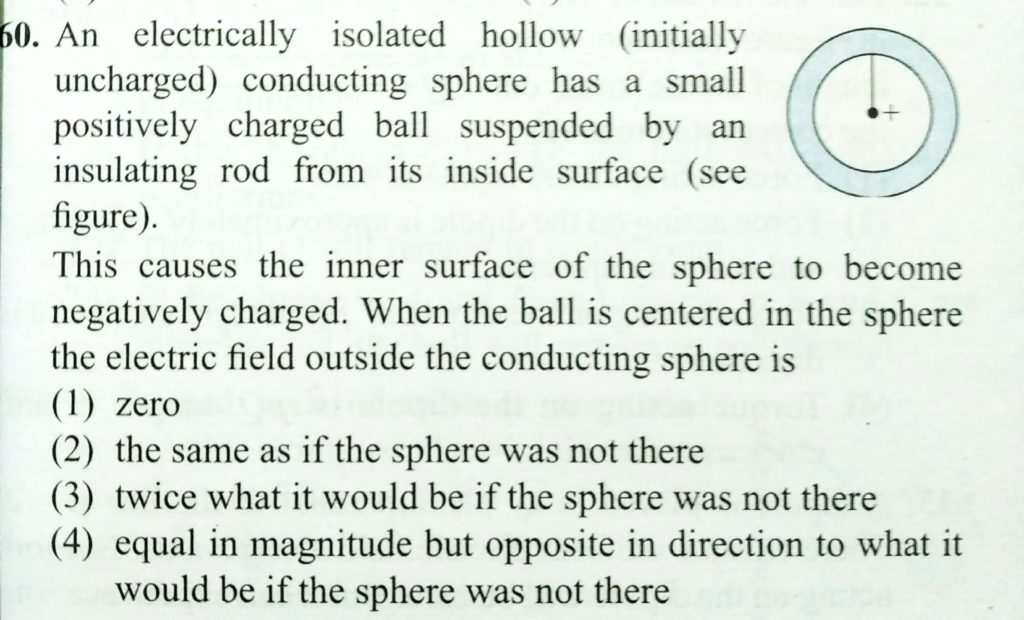 An electrically isolated hollow (initially uncharged), conducting sphere has a small positively charged ball suspended by an insulating rod from its inside surface, see diagram This causes the inner surface of the sphere to become negatively charged. When the ball is centred in the sphere the electric field outside the conducting sphere is