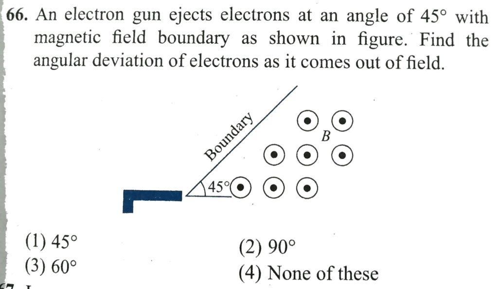 An electron gun ejects electron at an angle of 45 degree with magnetic field boundry as shown in figure. Find the angular deviation of electrons as it comes out of field. An electron gun ejects electron at an angle of 45 degree with magnetic field boundry as shown in figure. Find the angular deviation of electrons as it comes out of field. October 14, 2020 Category: Uncategorised (JEE Advanced Physics by BM Sharma + GMP Solutions) , Facebook Messenger WhatsApp Share this:TwitterFacebook Related