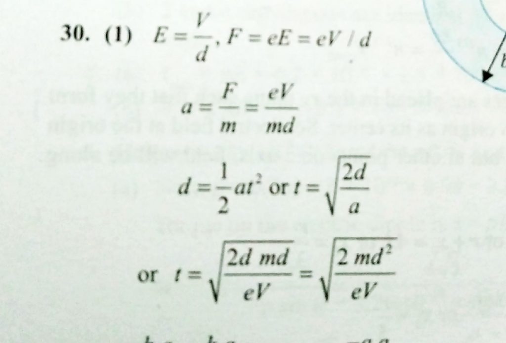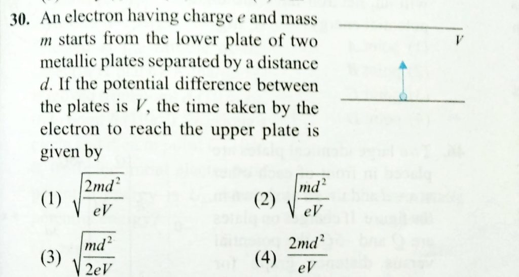 An electron having charge e and mass m starts from the lower plate of two metallic plates separated by a distance d. If the potential difference between the plates is V, the time taken by the electron to reach the upper plate is given by An electron having charge e and mass m starts from the lower plate of two metallic plates separated by a distance d. If the potential difference between the plates is V the time taken by the electron to reach the upper plate is given by November 5, 2020 Category: Uncategorised (JEE Advanced Physics by BM Sharma + GMP Solutions) , Facebook Messenger WhatsApp Share this:TwitterFacebook Related