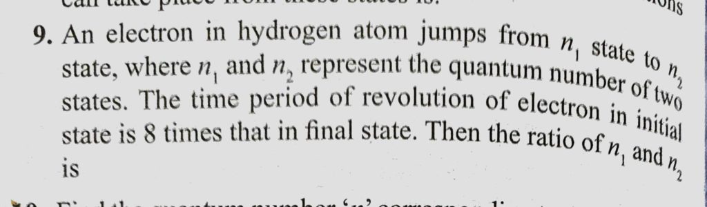 An electron in hydrogen atom jumps from n1 state to n2 state, where n1 and n2 represent the quantum number of two states. The time period of revolution of electron in initial state is 8 times An electron in hydrogen atom jumps from n1 state to n2 state where n1 and n2 represent the quantum number of two states. The time period of revolution of electron in initial state is 8 times October 16, 2020 Category: Uncategorised (JEE Advanced Physics by BM Sharma + GMP Solutions) , Facebook Messenger WhatsApp Share this:TwitterFacebook Related