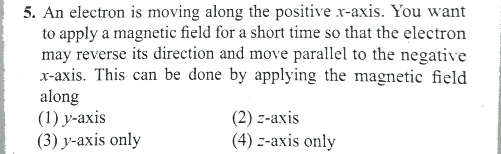 An electron is moving along the positive x-axis. You want to apply a magnetic field for a short time so that the electron may reverse its direction and move parallel to the negative x-axis. This can be done by applying the magnetic field along : The force F experienced by a particle of chrage q moving with a velocity v in a magnetic field B is given by F = q ( v x B 0. which pairs of vectors are at right angles to each other ? October 14, 2020 Category: Uncategorised (JEE Advanced Physics by BM Sharma + GMP Solutions) , Facebook Messenger WhatsApp Share this:TwitterFacebook Related