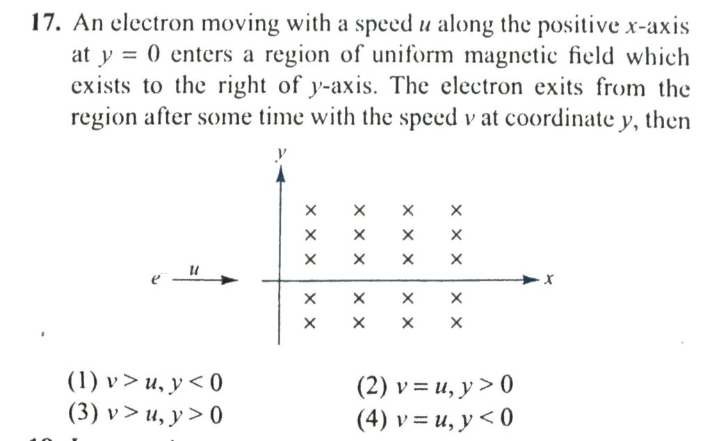 An electron moving with a speed u along the positive x-axis at y=0 enters a region of uniform magnetic field which exists to the right of y-axis. The electron exits from the region after some time with the speed v at coordinate y, then An electron is launched with velocity v in a uniform magnetic field B. The angle θ between v and B lies between 0 and π/2. Its velocity vector v returns to its initial value in a time interval of October 13, 2020 Category: Uncategorised (JEE Advanced Physics by BM Sharma + GMP Solutions) , Facebook Messenger WhatsApp Share this:TwitterFacebook Related