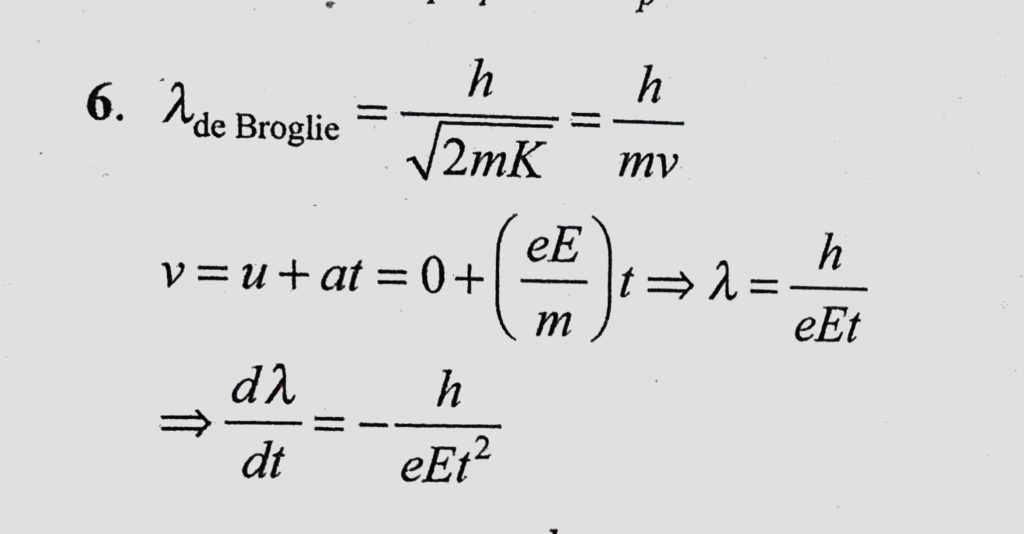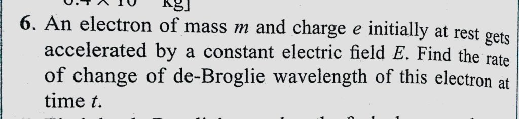 An electron of mass m and charge e initially at rest gets accelerated by a constant electric field E. Find the rate of change of de-Broglie wavelength of this electron at time t. An electron of mass m and charge e initially at rest gets accelerated by a constant electric field E. Find the rate of change of de-Broglie wavelength of this electron at time t. October 12, 2020 Category: Uncategorised (JEE Advanced Physics by BM Sharma + GMP Solutions) , Facebook Messenger WhatsApp Share this:TwitterFacebook Related