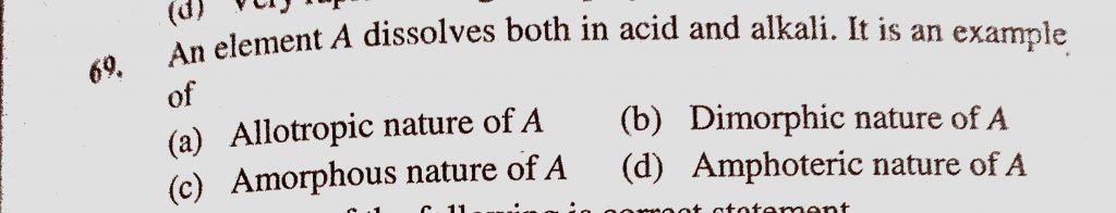 An element A dissolves both in acid and alkali. It is an example of (a) Allotropic nature of A (b) Dimorphic nature of A An element A dissolves both in acid and alkali. It is an example of (a) Allotropic nature of A (b) Dimorphic nature of A November 17, 2020 Category: Uncategorised (JEE Advanced Physics by BM Sharma + GMP Solutions) , Facebook Messenger WhatsApp Share this:TwitterFacebook Related