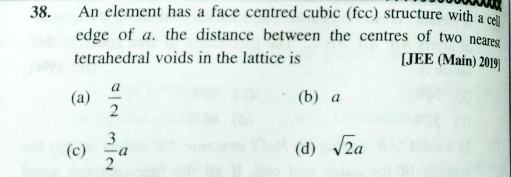 An element has a face centred cubic ( fcc ) structure with a cell edge of a. the distance between the centres of two nearest tetrahedral voids in the lattice is An element has a face centred cubic ( fcc ) structure with a cell edge of a. the distance between the centres of two nearest tetrahedral voids in the lattice is February 10, 2021 Category: Uncategorised (JEE Advanced Physics by BM Sharma + GMP Solutions) , Facebook Messenger WhatsApp Share this:TwitterFacebook Related