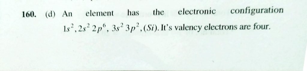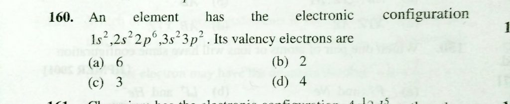 An element has the electronic configuration 1s^2 , 2s^2 2p^6, 3s^2 3p^2 . Its valency eletrons are (a) 6 (b) 2 (c) 3 (d) 4 2s2 2p6 3s^2 3p^2 . Its valency eletrons are (a) 6 (b) 2 (c) 3 (d) 4 An element has the electronic configuration 1s^2 November 29, 2020 Category: Uncategorised (JEE Advanced Physics by BM Sharma + GMP Solutions) , Facebook Messenger WhatsApp Share this:TwitterFacebook Related