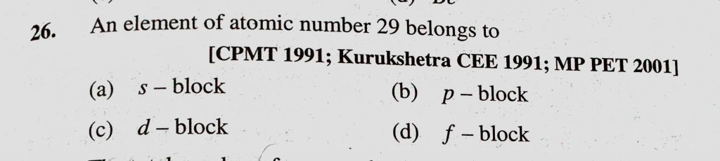 An element of atomic number 29 belongs to (a) s-block (b) p-block (c) d-block (d) f-block An element of atomic number 29 belongs to (a) s-block (b) p-block (c) d-block (d) f-block November 8, 2020 Category: Uncategorised (JEE Advanced Physics by BM Sharma + GMP Solutions) , Facebook Messenger WhatsApp Share this:TwitterFacebook Related