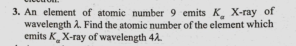 An element of atomic number 9 emits K alpha X-ray of wavelength lemda. Find the atomic number of the element which emits K alpha X-ray of wavelength 4 lemda. An element of atomic number 9 emits K alpha X-ray of wavelength lemda. Find the atomic number of the element which emits K alpha X-ray of wavelength 4 lemda. October 14, 2020 Category: Uncategorised (JEE Advanced Physics by BM Sharma + GMP Solutions) , Facebook Messenger WhatsApp Share this:TwitterFacebook Related