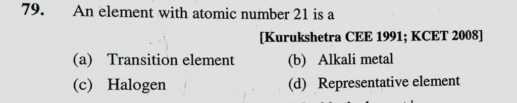 An element with atomic number 21 is a (a) Transition element (b) Alkali metal (c) Halogen (d) Representative element An element with atomic number 21 is a (a) Transition element (b) Alkali metal (c) Halogen (d) Representative element November 9, 2020 Category: Uncategorised (JEE Advanced Physics by BM Sharma + GMP Solutions) , Facebook Messenger WhatsApp Share this:TwitterFacebook Related