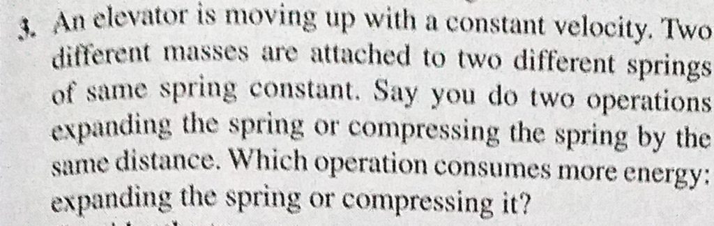 An elevator is moving up with a constant velocity. Two different masses are attached to two different springs of same spring constant. Say you do two operations expanding the spring or An elevator is moving up with a constant velocity. Two different masses are attached to two different springs of same spring constant. Say you do two operations expanding the spring or October 2, 2020 Category: Uncategorised (JEE Advanced Physics by BM Sharma + GMP Solutions) , Facebook Messenger WhatsApp Share this:TwitterFacebook Related