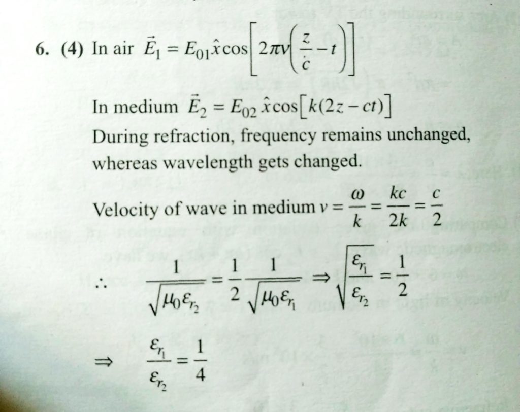 An EM wave from air enters a medium. The electric fields are E1 = E01 x cos [ 2 pie v { z/c – t } ] in air and E 2 =E 02 x ^ cos[k(2z−ct)] in medium, where the wave number k and frequency v refer to their values in air. The medium is non-magnetic. If ϵ r 1 and ϵ r 2 refer to relative permittivities of air and medium respectively, which of the following options is correct?