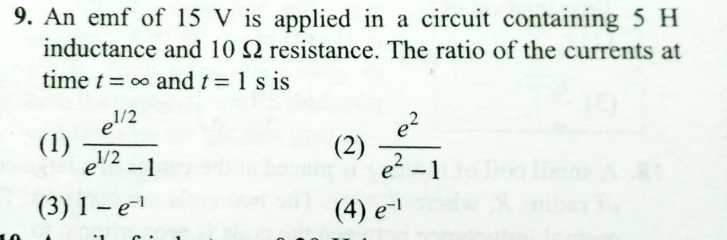 An emf of 15 V is applied in a circuit containing 5 H inductance and 10 ohm resistance . The ratio of the currents at time t = infinity and t = 1 s is An emf of 15 V is applied in a circuit containing 5 H inductance and 10 ohm resistance . The ratio of the currents at time t = infinity and t = 1 s is October 22, 2020 Category: Uncategorised (JEE Advanced Physics by BM Sharma + GMP Solutions) , Facebook Messenger WhatsApp Share this:TwitterFacebook Related