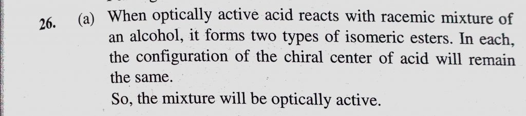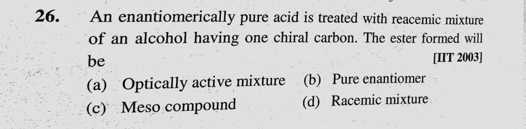 An enantiomerically pure acid is treated with reacemic mixture of an alcohol having one chiral carbon. The ester formed will be (a) Optically active mixture (b) Pure enantiomer An enantiomerically pure acid is treated with reacemic mixture of an alcohol having one chiral carbon. The ester formed will be (a) Optically active mixture (b) Pure enantiomer February 13, 2021 Category: Uncategorised (JEE Advanced Physics by BM Sharma + GMP Solutions) , Facebook Messenger WhatsApp Share this:TwitterFacebook Related