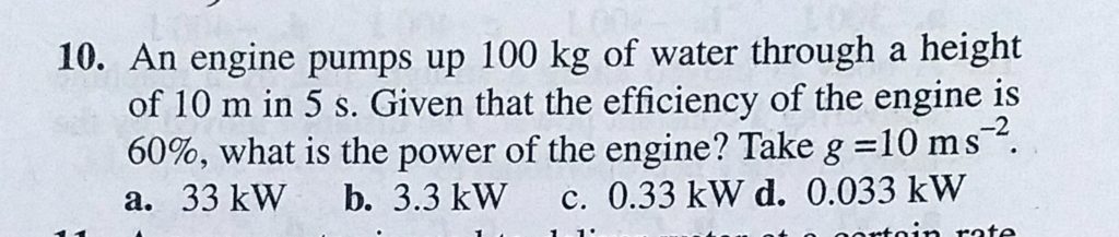 An engine pumps up 100 kg of water through a height of 10 m in 5 s. Given that the efficiency of the engine is 60%, what is the power of the engine? Take g = 10 m/s^2. An engine pumps up 100 kg of water through a height of 10 m in 5 s. Given that the efficiency of the engine is 60% what is the power of the engine? Take g = 10 m/s^2. October 3, 2020 Category: Uncategorised (JEE Advanced Physics by BM Sharma + GMP Solutions) , Facebook Messenger WhatsApp Share this:TwitterFacebook Related