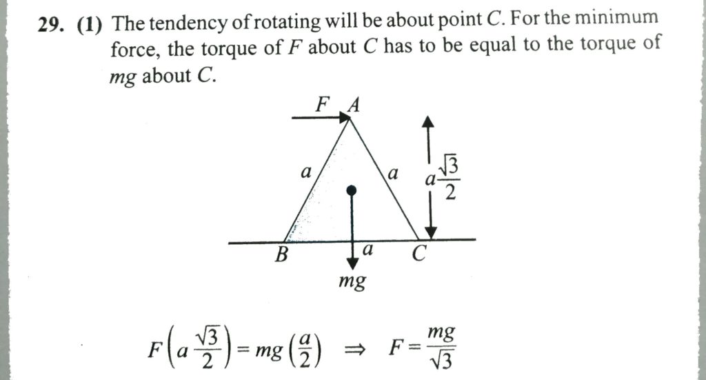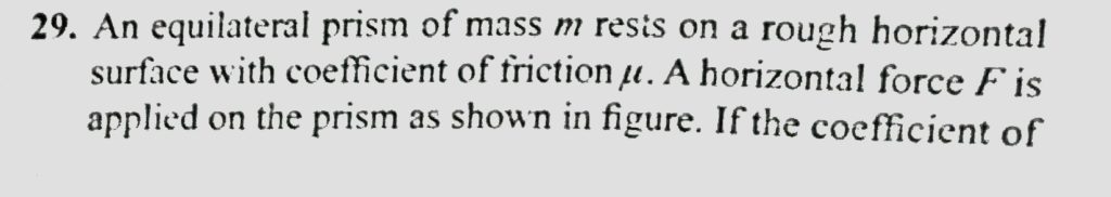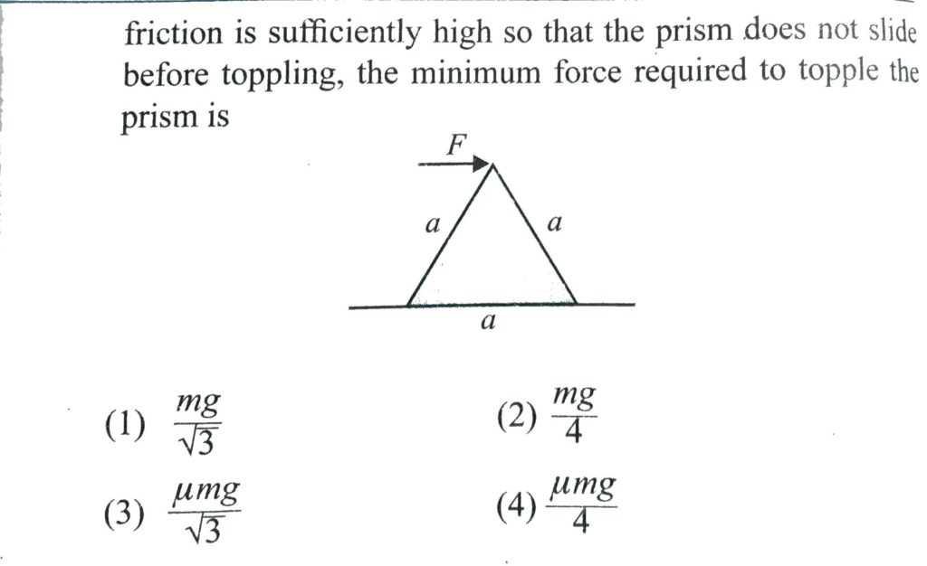 An equilateral prism of mass m rests on a rough horizontal surface with coefficient of friction μ. A horizontal force F is applied on the prism as shown in figure. If the coefficient of friction is sufficiently high so that the prism does not slide before toppling, the minimum force required to topple the prism is
