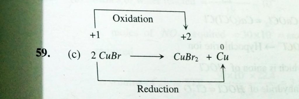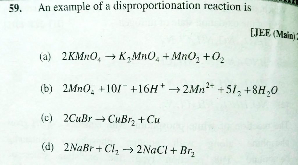 An example of a diproportionation reaction is (a) 2KMnO4 gives K2MnO4 +MnO2 + O2 (b) 2MnO4^- +10I^- +16H^+ gives 2Mn^2+ +5I2 +8H2O (c) 2CuBr gives CuBr2 +Cu (d) 2NaBr +Cl2 gives 2NaCl +Br2 An example of a diproportionation reaction is (a) 2KMnO4 gives K2MnO4 +MnO2 + O2 (b) 2MnO4^- +10I^- +16H^+ gives 2Mn^2+ +5I2 +8H2O (c) 2CuBr gives CuBr2 +Cu (d) 2NaBr +Cl2 gives 2NaCl +Br2 November 25, 2020 Category: Uncategorised (JEE Advanced Physics by BM Sharma + GMP Solutions) , Facebook Messenger WhatsApp Share this:TwitterFacebook Related