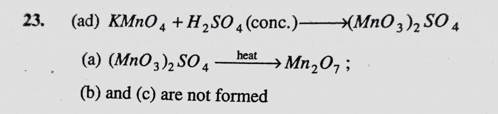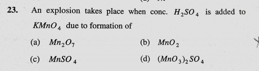 An explosion takes place when conc. H2SO4 is added to KMnO4 due to formation of (a) Mn2O7 (b) MnO2 (c) MnSO4 (d) (MnO3)2SO4 An explosion takes place when conc. H2SO4 is added to KMnO4 due to formation of (a) Mn2O7 (b) MnO2 (c) MnSO4 (d) (MnO3)2SO4 December 3, 2020 Category: Uncategorised (JEE Advanced Physics by BM Sharma + GMP Solutions) , Facebook Messenger WhatsApp Share this:TwitterFacebook Related
