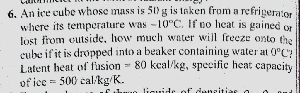 An ice cube whose mass is 50 g is taken from a refrigerator where its temperature was -10 C. If no heat is gained or lost from outside, how much water will freeze onto the cube if it is dropped An ice cube whose mass is 50 g is taken from a refrigerator where its temperature was -10 C. If no heat is gained or lost from outside how much water will freeze onto the cube if it is dropped October 23, 2020 Category: Uncategorised (JEE Advanced Physics by BM Sharma + GMP Solutions) , Facebook Messenger WhatsApp Share this:TwitterFacebook Related