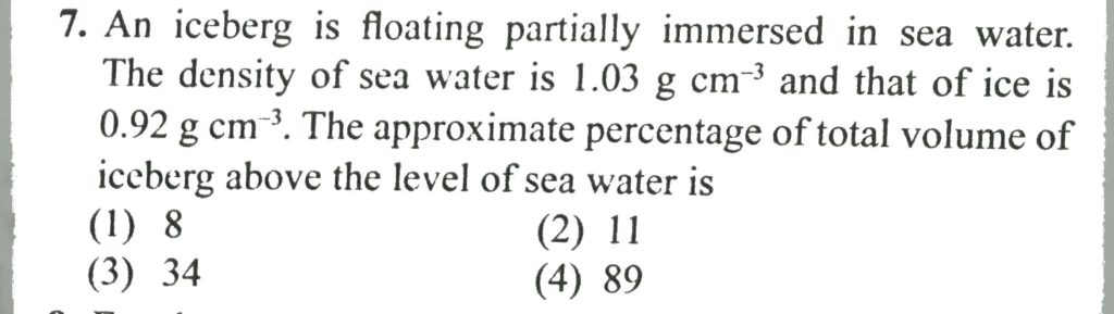 An iceberg is floating partially immersed in sea water the density of sea water is 1.03 gm/cm^3 and that of ice is 0.92 gm/cm^3 what is the fraction of the total volume of the iceberg above the level of sea-water? Water is used as the manometric liquid in a pitot tube mounted in an aircraft to measure air speed. If the maximum difference in height between the liquid columns is 0.1 m what is the maximum air speed that can be measured? Density of air dair = 1.3 kg/m^3 October 7, 2020 Category: Uncategorised (JEE Advanced Physics by BM Sharma + GMP Solutions) , Facebook Messenger WhatsApp Share this:TwitterFacebook Related