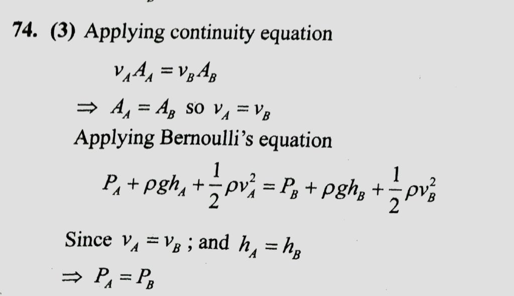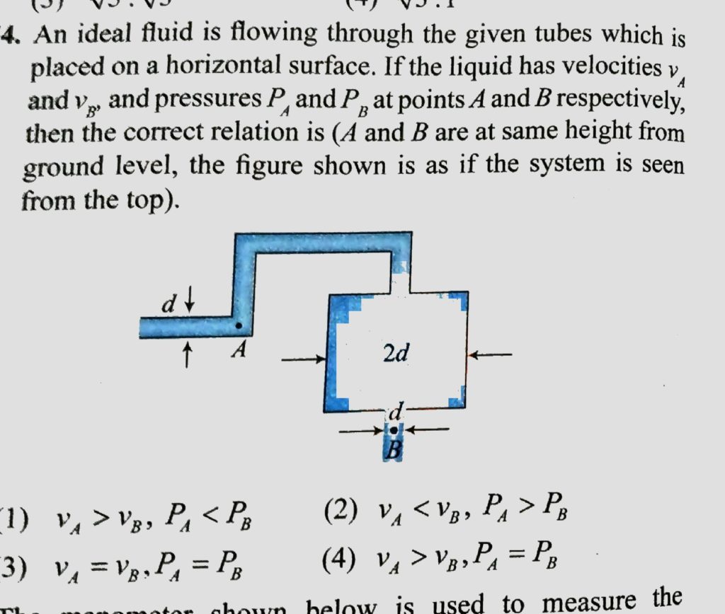An ideal fluid is flowing through the given tubes which is placed on a horizontal surface. If the liquid has velocities VA and VB and pressure PA and PB at point A and B respectively, then the correct relation is (A and B are at same height from ground level. the figure shown is as in the system is seen from the top):
