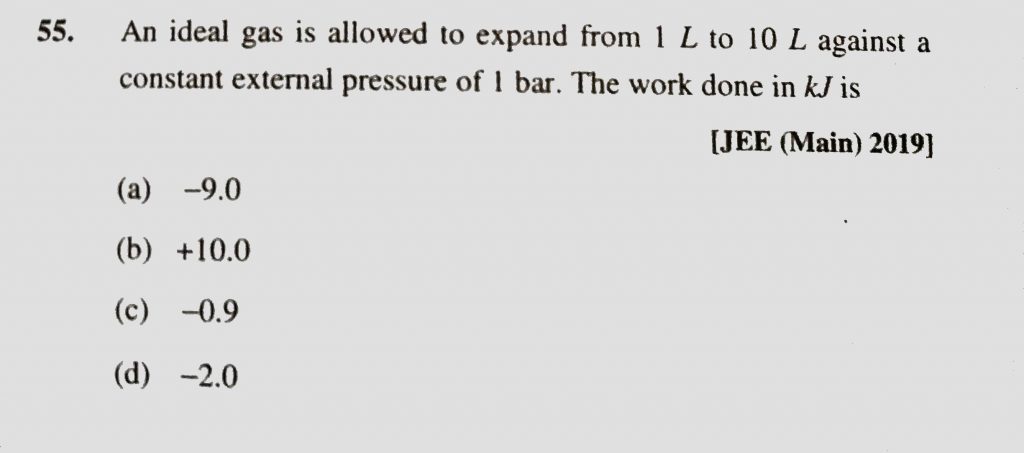 AN ideal gas is allowed to expand from 1 L to 10 L against a constant external pressure of 1 bar . The work done in KJ is AN ideal gas is allowed to expand from 1 L to 10 L against a constant external pressure of 1 bar . The work done in KJ is February 12, 2021 Category: Uncategorised (JEE Advanced Physics by BM Sharma + GMP Solutions) , Facebook Messenger WhatsApp Share this:TwitterFacebook Related